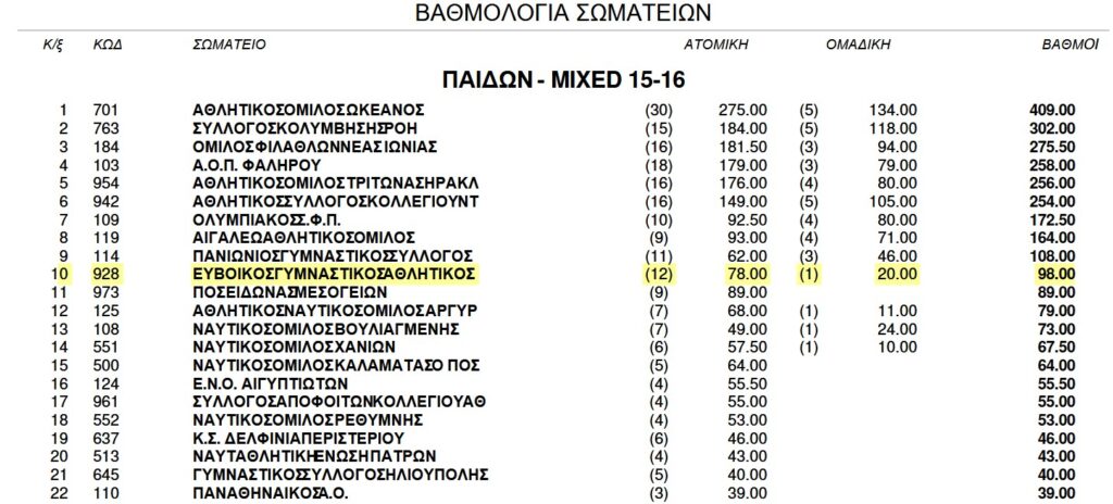 - 15η Θέση στη Γενική Βαθμολογία Παίδων – Κορασίδων (ανάμεσα σε 65 σωματεία).