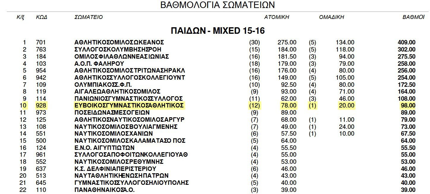 - 10η Θέση στην κατηγορία Παίδων (ανάμεσα σε 45 βαθμολογούμενα σωματεία).